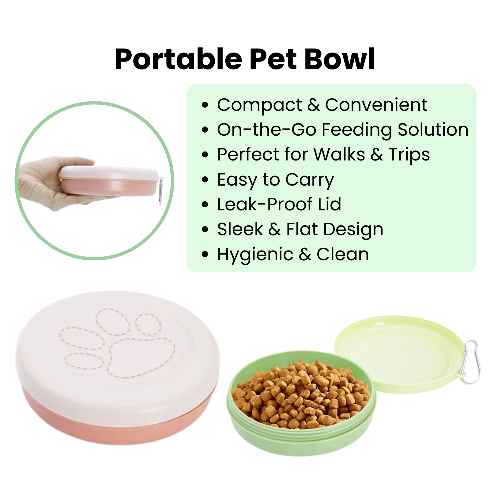 Dankzij het platte, elegante ontwerp is deze bak eenvoudig vast te pakken en mee te nemen. De afsluitbare dekselhoudt voer of water fris en voorkomt morsen, ideaal voor uitstapjes, wandelingen of reizen. Met deze compacte en hygiënische voer-/drinkbak is je huisdier altijd voorzien van het nodige, waar je avontuur je ook brengt!