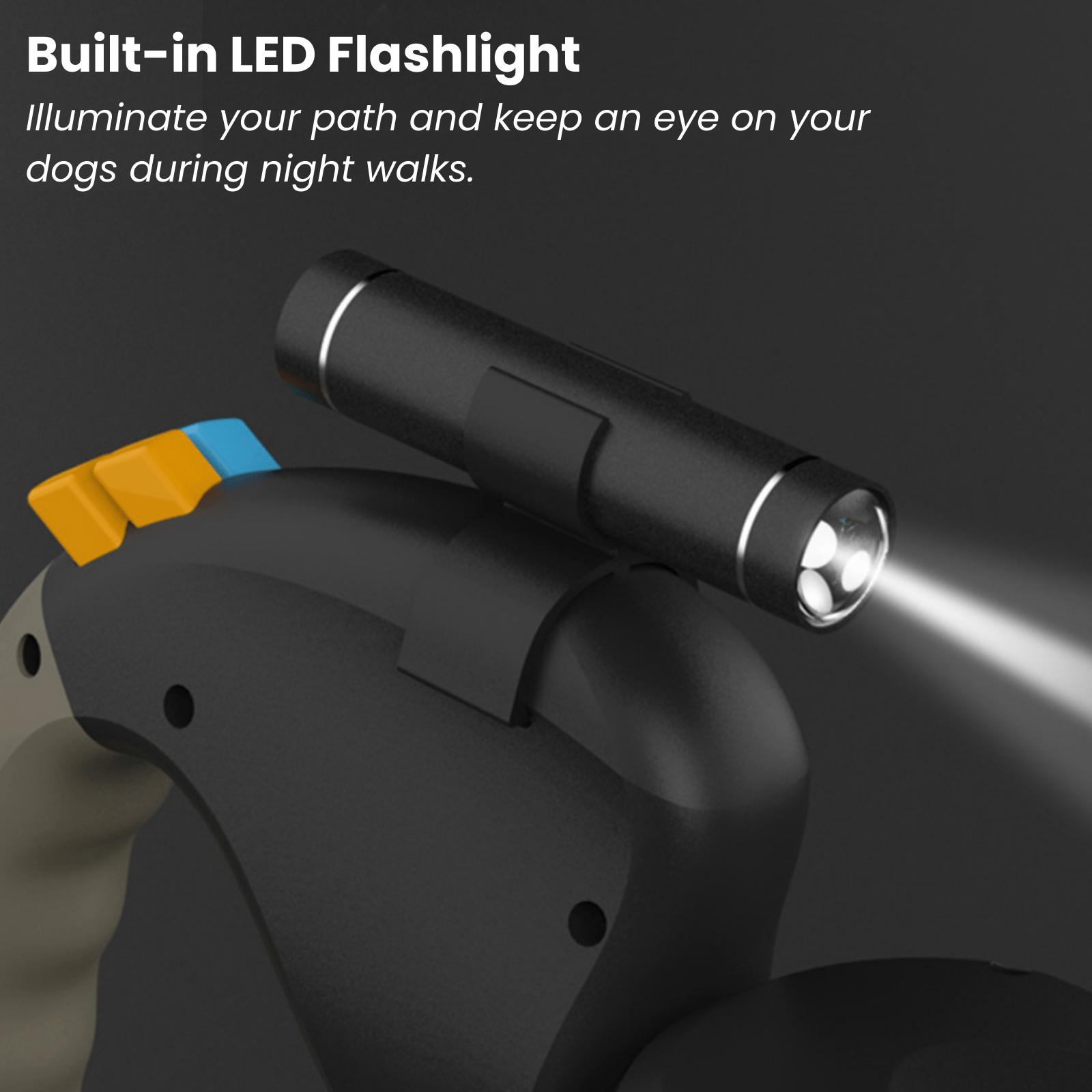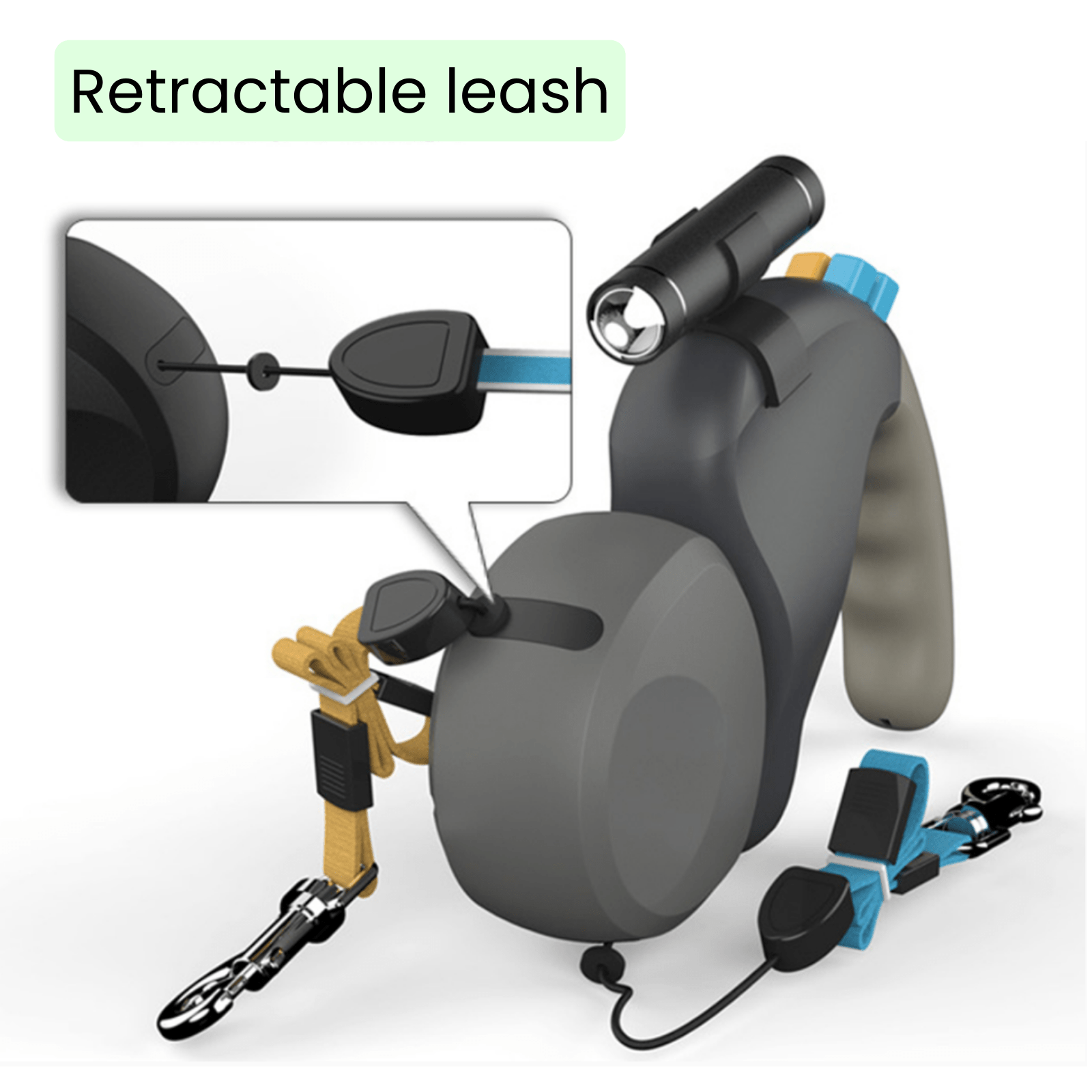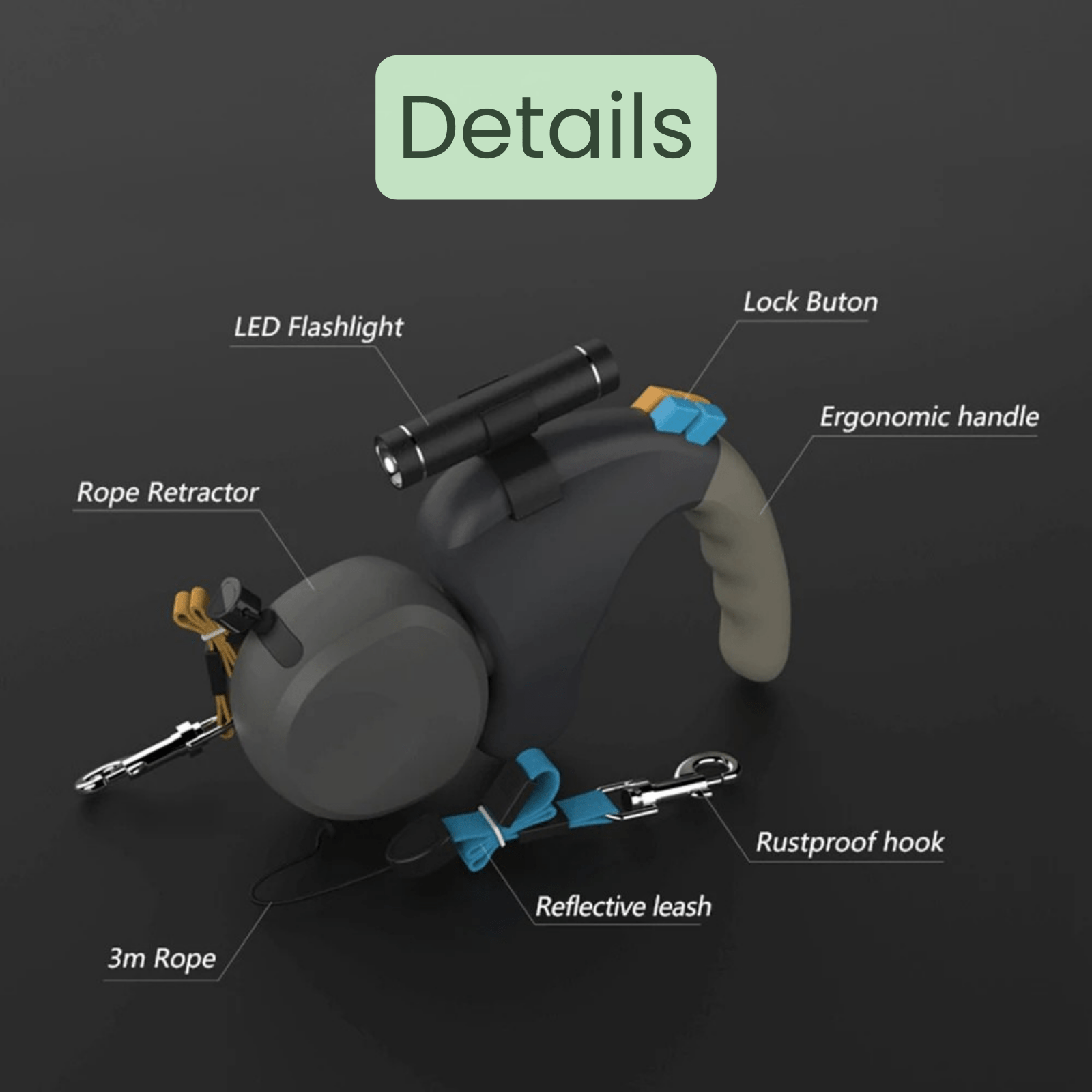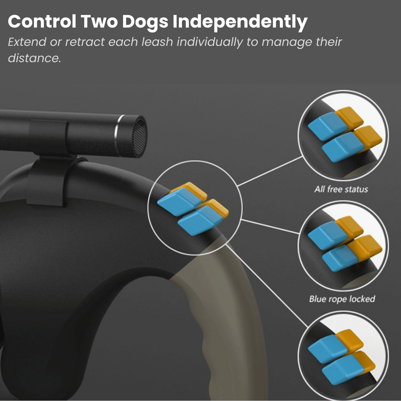 Deze hondenriem heeft twee automatisch intrekbare lijnen die 360 graden kunnen draaien, waardoor ze nooit in de knoop raken. Dit geeft elke hond voldoende bewegingsvrijheid. Je kunt elke hond afzonderlijk stoppen, wat zorgt voor optimale controle tijdens de wandeling.
