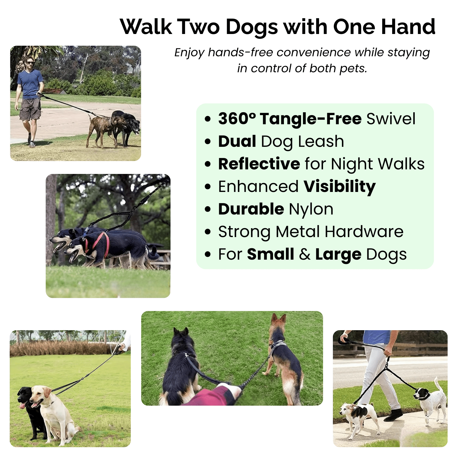 Met deze dubbele hondenriem wandel je moeiteloos met twee honden tegelijk – zonder klitten of chaos. De tangle-free draaikoppeling voorkomt dat de riemen in de knoop raken, terwijl de reflecterende stiksels zorgen voor extra zichtbaarheid tijdens avondwandelingen. Gemaakt van duurzaam metaal en stevig nylon, en ook te gebruiken als veiligheidskoppeling in de auto.