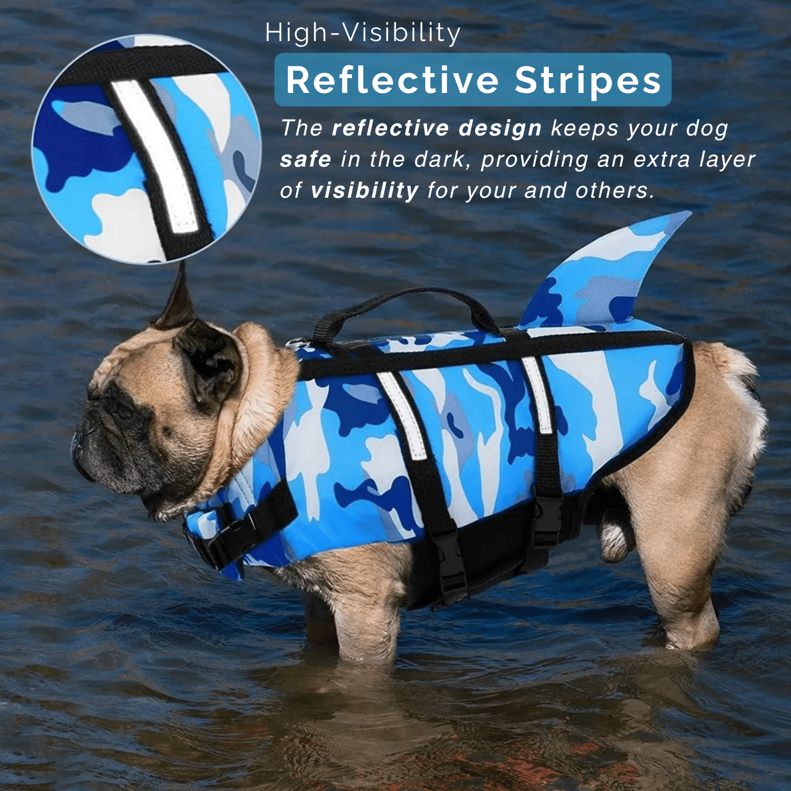 Laat jouw hond veilig én stoer zwemmen met dit camouflage reddingsvest met haaienvin. Gemaakt van hoogwaardig polyester oxford en nylon, gevuld met schuim voor extra drijfvermogen. De opvallende camouflagekleuren in fuchsia of blauw maken jouw viervoeter goed zichtbaar, terwijl de verstelbare riemen en snelsluitingen zorgen voor een comfortabele pasvorm. Voorzien van een stevig handvat op de rug en een D-ring voor het bevestigen van een lijn. Ideaal voor zomerse wateravonturen!