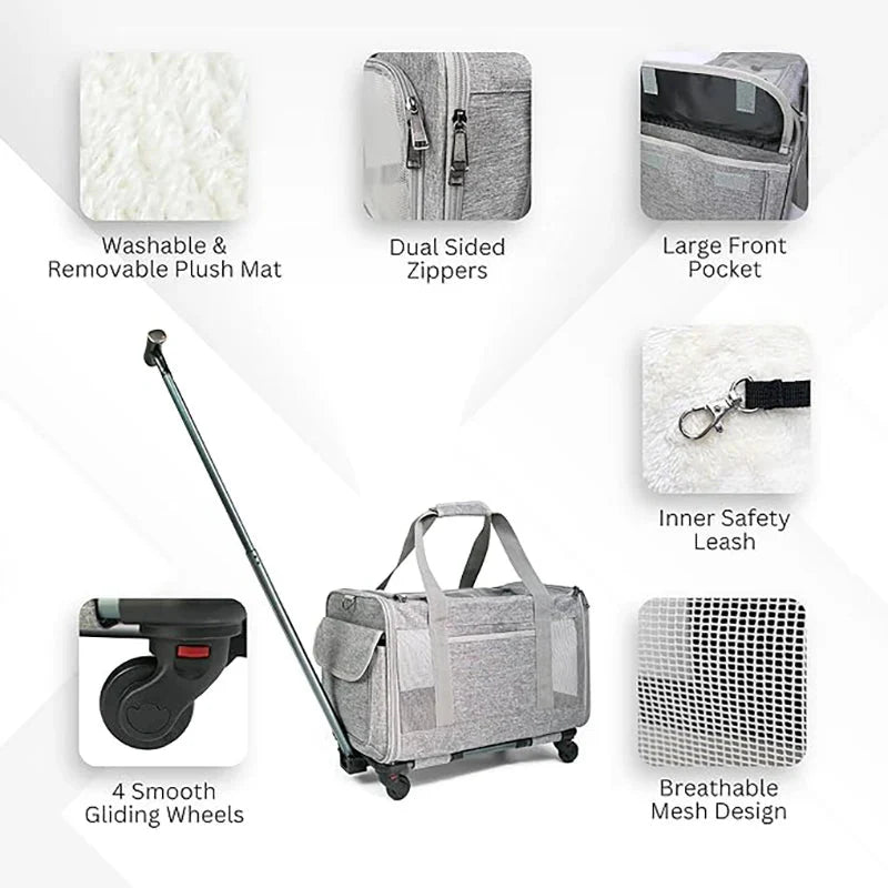 Handige mobiliteit: Dankzij de soepel rollende wielen en telescopische handgreep beweegt u moeiteloos door luchthavens, stations of drukke straten zonder uw huisdier te hoeven dragen.