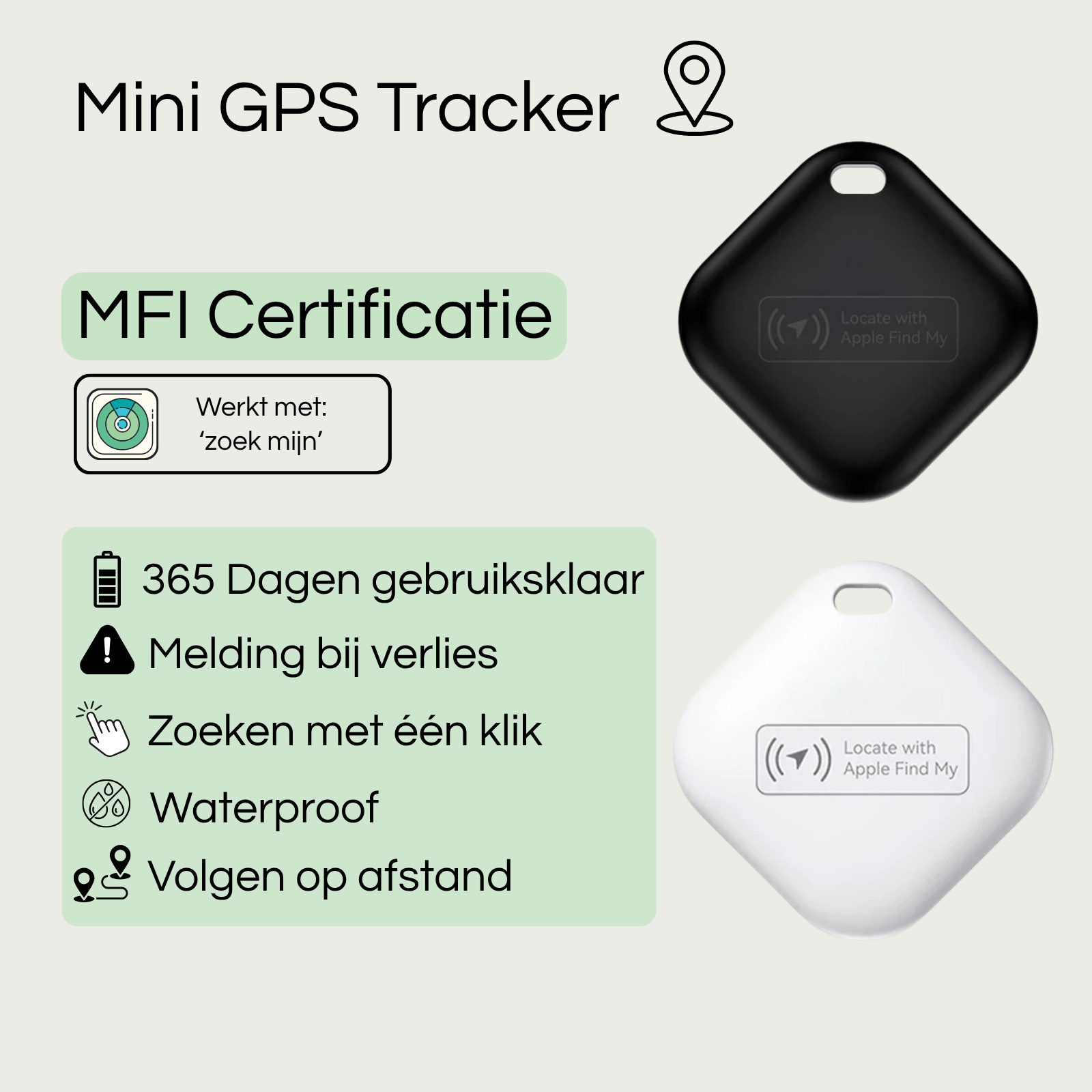 Waterbestendig en Duurzaam: Bestand tegen vocht, perfect voor buitenexcursies. De tracker wordt geleverd met een vervangbare CR2032-batterij die tot wel een jaar meegaat.