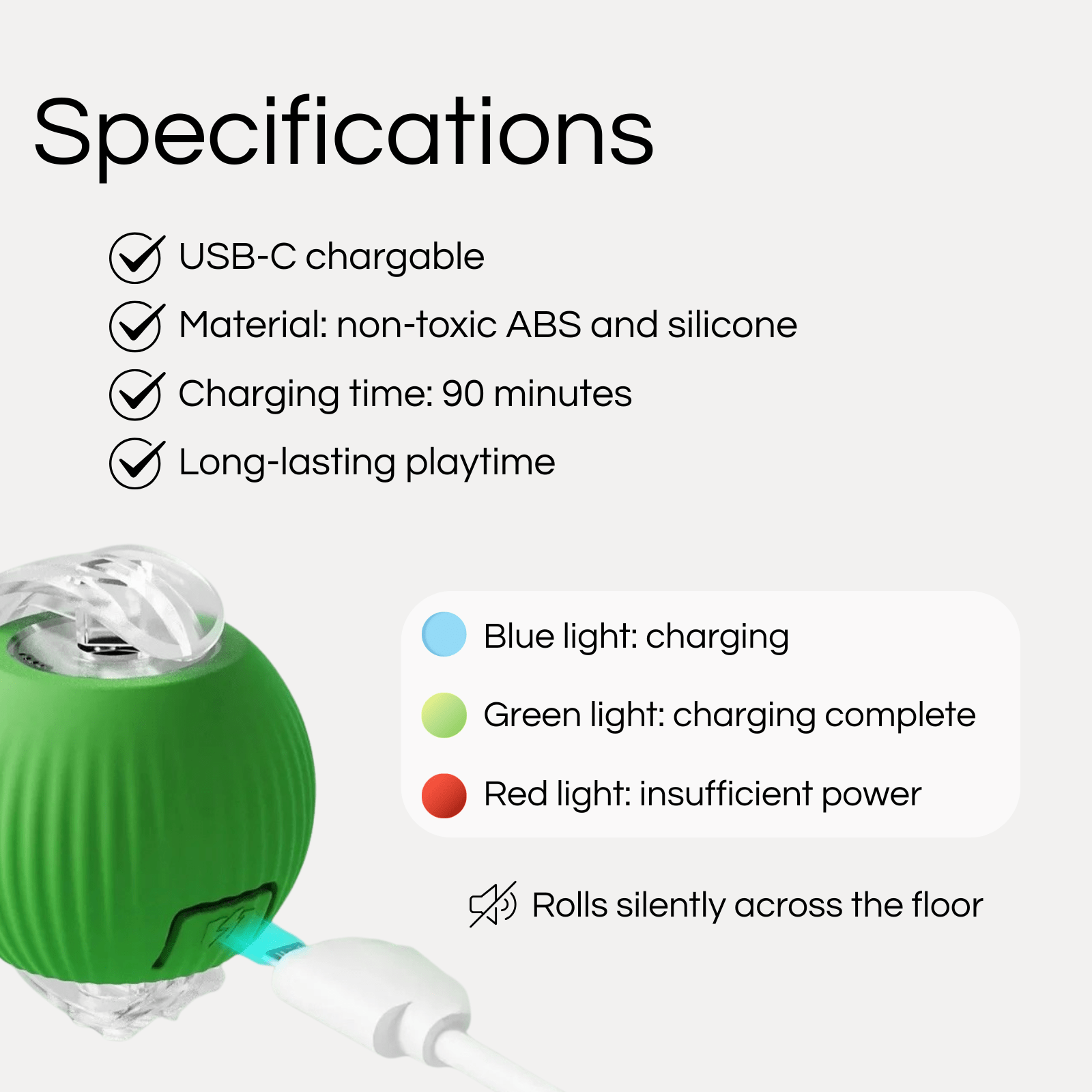- Stil: De bal rolt geluidloos, zodat je kat of hond zonder verstoring kan spelen.