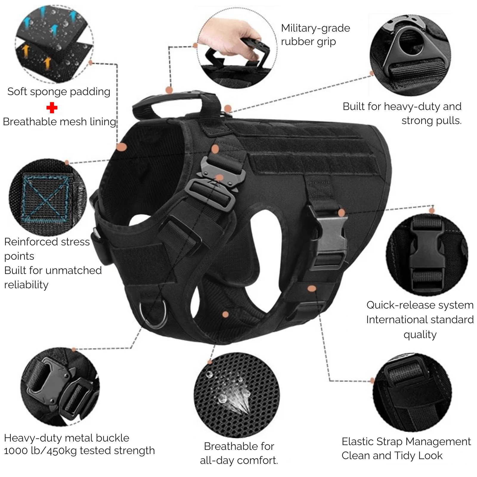 Duurzaam & comfortabel: Gemaakt van sterk 1000D nylon met zachte voering en ademende padding. Verstevigde stiksels en robuuste metalen gespen zorgen voor langdurig en intensief gebruik, zelfs bij trekkende honden.