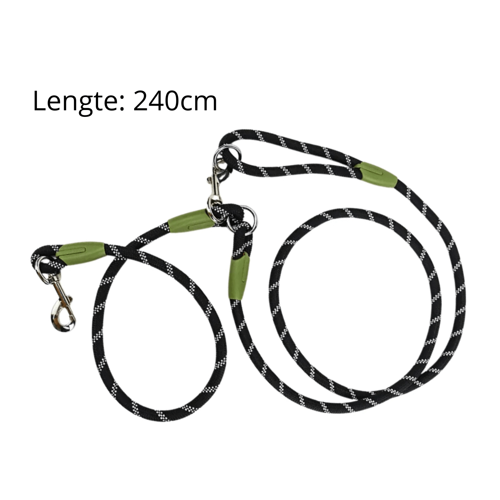 Handvrije Looplijn (1.0x240cm, kleur naar keuze): Ervaar optimale bewegingsvrijheid met deze duurzame lijn van nylon en een metalen ketting, die bijtschade voorkomt. De reflecterende strepen zorgen voor extra veiligheid in het donker. Geschikt voor alle honden, van klein tot groot.