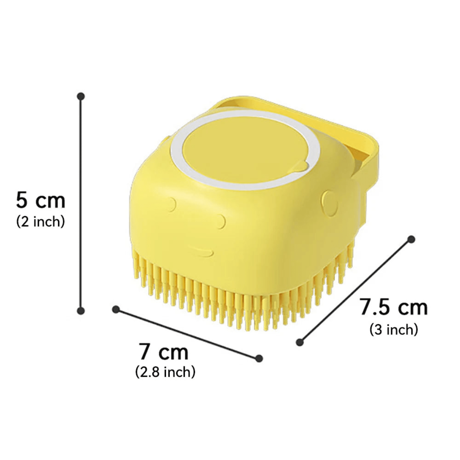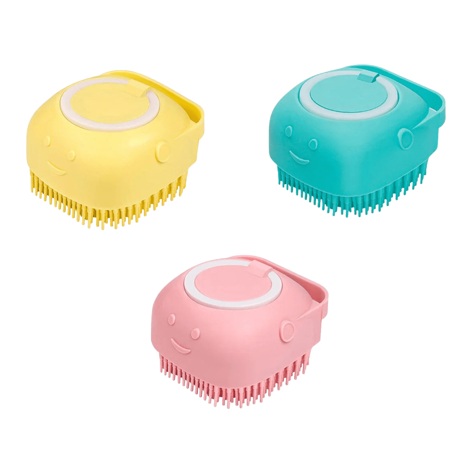 Badborstel met Shampoo Dispenser (Kleur naar keuze): Een zachte siliconen badborstel met geïntegreerd schuimreservoir voor efficiënt wassen en masseren. Verwijdert vuil en losse haren en is geschikt voor korte en lange vachten van honden, katten en kleine huisdieren. Verkrijgbaar in blauw, roze of geel. Afmetingen: 7.5 × 7 × 5 cm.